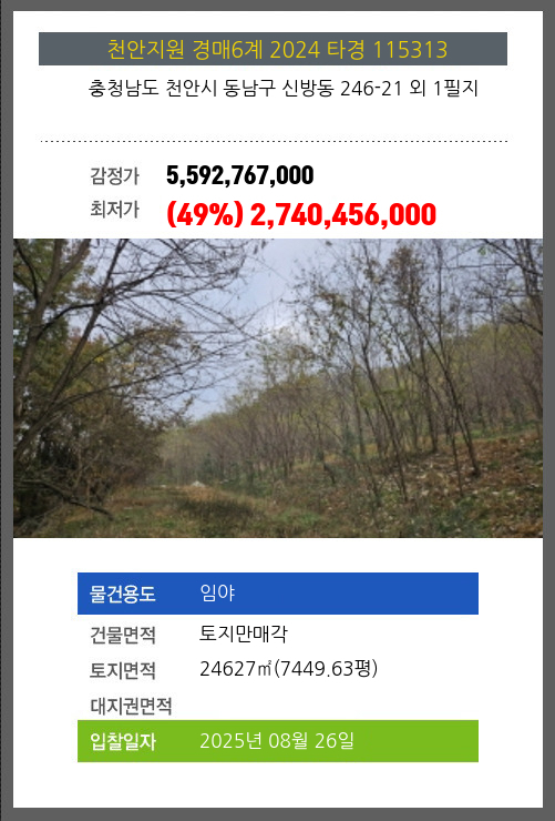 사건번호 2024 타경 115313 본건은 충청남도 천안시 동남구 신방동 246-21 외 1필지소재하는 임야경매 물건의 포스팅입니다. 건물면적 [ 토지만매각 ]토지면적 [ 24627㎡ (7449.63평) ] 시세를 반영한