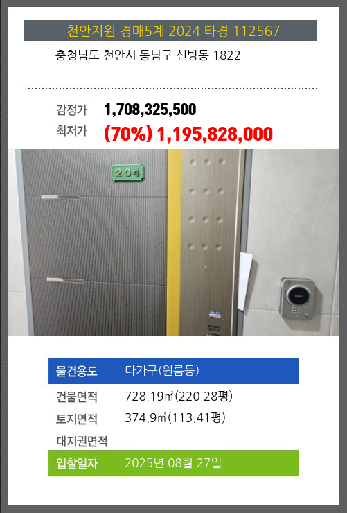 사건번호 2024 타경 112567 본건은 충청남도 천안시 동남구 신방동 1822소재하는 다가구(원룸등)경매 물건의 포스팅입니다. 건물면적 [ 728.19㎡ (220.28평) ]토지면적 [ 374.9㎡ (113.41평) ] 시세를 반영한 감정가