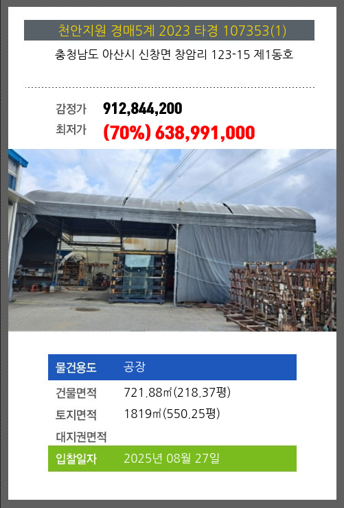 사건번호 2023 타경 107353(1) 본건은 충청남도 아산시 신창면 창암리 123-15 제1동호소재하는 공장경매 물건의 포스팅입니다. 건물면적 [ 721.88㎡ (218.37평) ]토지면적 [ 1819㎡ (550.25평) ] 시세를 반영한
