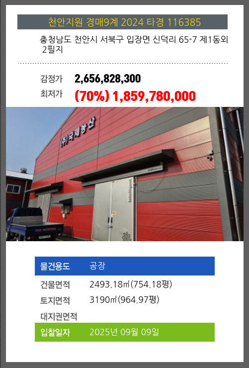 사건번호 2024 타경 116385 본건은 충청남도 천안시 서북구 입장면 신덕리 65-7 제1동외 2필지소재하는 공장경매 물건의 포스팅입니다. 건물면적 [ 2493.18㎡ (754.18평) ]토지면적 [ 3190㎡ (964.97평) ]