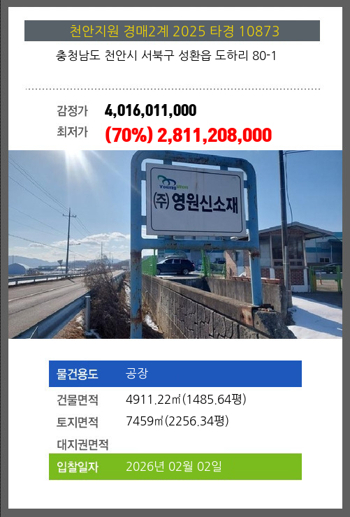 사건번호 2025 타경 10873 본건은 충청남도 천안시 서북구 성환읍 도하리 80-1소재하는 공장경매 물건의 포스팅입니다. 건물면적 [ 4911.22㎡ (1485.64평) ]토지면적 [ 7459㎡ (2256.34평) ] 시세를 반영한