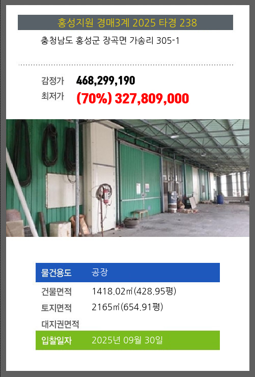 사건번호 2025 타경 238 본건은 충청남도 홍성군 장곡면 가송리 305-1소재하는 공장경매 물건의 포스팅입니다. 건물면적 [ 1418.02㎡ (428.95평) ]토지면적 [ 2165㎡ (654.91평) ] 시세를 반영한 감정가