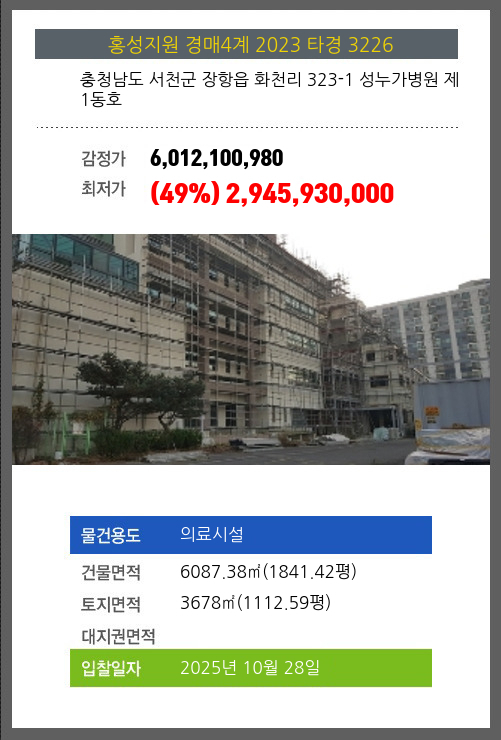 사건번호 2023 타경 3226 본건은 충청남도 서천군 장항읍 화천리 323-1 성누가병원 제1동호소재하는 의료시설경매 물건의 포스팅입니다. 건물면적 [ 6087.38㎡ (1841.42평) ]토지면적 [ 3678㎡ (1112.59평) ] 시세를