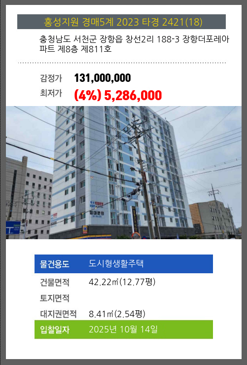사건번호 2023 타경 2421(18) 본건은 충청남도 서천군 장항읍 창선2리 188-3 장항더포레아파트 제8층 제811호소재하는 도시형생활주택경매 물건의 포스팅입니다. 건물면적 [ 42.22㎡ (12.77평) ]대지권 [ 8.41㎡ (2.54평) ]