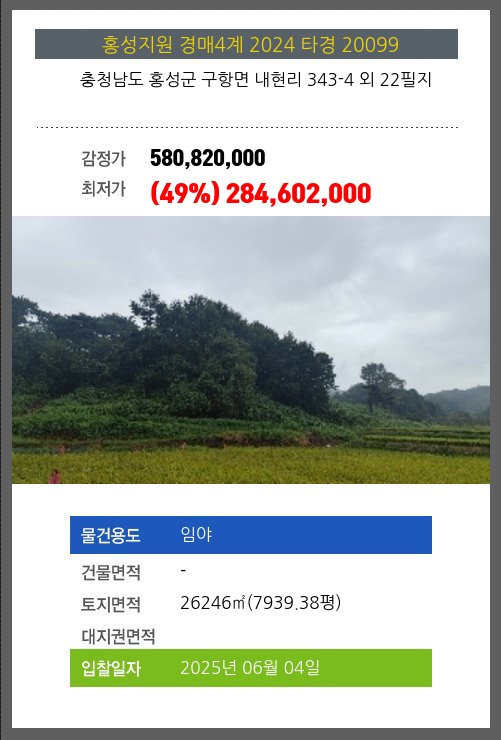 사건번호 2024 타경 20099 본건은 충청남도 홍성군 구항면 내현리 343-4 외 22필지소재하는 임야경매 물건의 포스팅입니다. 토지면적 [ 26246㎡ (7939.38평) ] 시세를 반영한 감정가 580,820,000에서2회 유찰되어