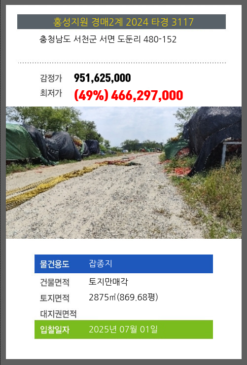 사건번호 2024 타경 3117 본건은 충청남도 서천군 서면 도둔리 480-152소재하는 잡종지경매 물건의 포스팅입니다. 건물면적 [ 토지만매각 ]토지면적 [ 2875㎡ (869.68평) ] 시세를 반영한 감정가 951,625,000에서2회