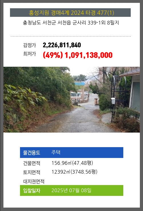 사건번호 2024 타경 477(1) 본건은 충청남도 서천군 서천읍 군사리 339-1외 8필지소재하는 주택경매 물건의 포스팅입니다. 건물면적 [ 156.96㎡ (47.48평) ]토지면적 [ 12392㎡ (3748.56평) ] 시세를 반영한