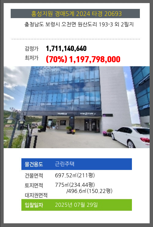 사건번호 2024 타경 20693 본건은 충청남도 보령시 오천면 원산도리 193-3 외 2필지소재하는 근린주택경매 물건의 포스팅입니다. 건물면적 [ 697.52㎡ (211평) ]토지면적 [ 전체:775㎡ (234.44평) 매각지분:496.6㎡ (150.22평)
