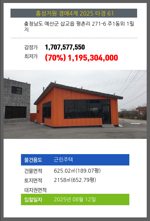 사건번호 2025 타경 61 본건은 충청남도 예산군 삽교읍 평촌리 271-6 주1동외 1필지소재하는 근린주택경매 물건의 포스팅입니다. 건물면적 [ 625.02㎡ (189.07평) ]토지면적 [ 2158㎡ (652.79평) ] 시세를