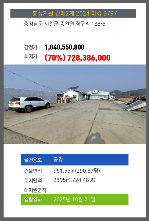 사건번호 2024 타경 3797 본건은 충청남도 서천군 종천면 장구리 188-6소재하는 공장경매 물건의 포스팅입니다. 건물면적 [ 961.56㎡ (290.87평) ]토지면적 [ 2395㎡ (724.48평) ] 시세를 반영한 감정가