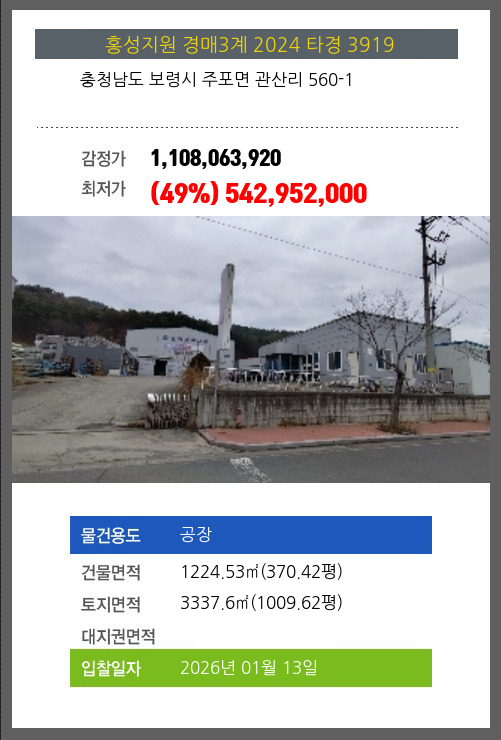사건번호 2024 타경 3919 본건은 충청남도 보령시 주포면 관산리 560-1소재하는 공장경매 물건의 포스팅입니다. 건물면적 [ 1224.53㎡ (370.42평) ]토지면적 [ 3337.6㎡ (1009.62평) ] 시세를 반영한 감정가