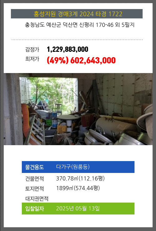 사건번호 2024 타경 1722 본건은 충청남도 예산군 덕산면 신평리 170-46 외 5필지소재하는 다가구(원룸등)경매 물건의 포스팅입니다. 건물면적 [ 370.78㎡ (112.16평) ]토지면적 [ 1899㎡ (574.44평) ] 시세를