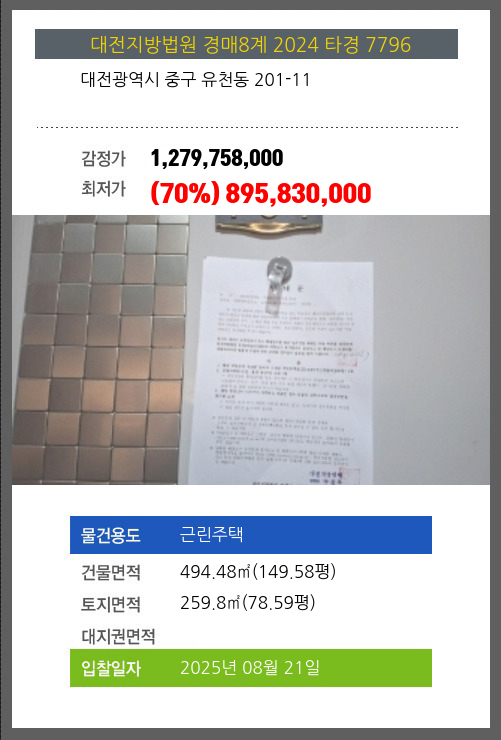 사건번호 2024 타경 7796 본건은 대전광역시 중구 유천동 201-11소재하는 근린주택경매 물건의 포스팅입니다. 건물면적 [ 494.48㎡ (149.58평) ]토지면적 [ 259.8㎡ (78.59평) ] 시세를 반영한 감정가 1,279,758,000에서1회