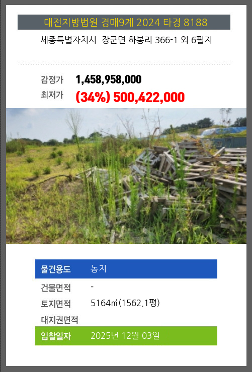사건번호 2024 타경 8188 본건은 세종특별자치시 장군면 하봉리 366-1 외 6필지소재하는 농지경매 물건의 포스팅입니다. 토지면적 [ 5164㎡ (1562.1평) ] 시세를 반영한 감정가 1,458,958,000에서3회 유찰되어 감정가