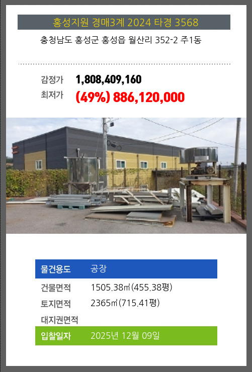 사건번호 2024 타경 3568 본건은 충청남도 홍성군 홍성읍 월산리 352-2 주1동소재하는 공장경매 물건의 포스팅입니다. 건물면적 [ 1505.38㎡ (455.38평) ]토지면적 [ 2365㎡ (715.41평) ] 시세를 반영한