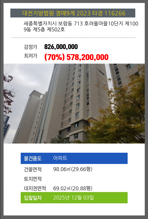 사건번호 2023 타경 116266 본건은 세종특별자치시 보람동 713 호려울마을10단지 제1009동 제5층 제502호소재하는 아파트경매 물건의 포스팅입니다. 건물면적 [ 98.06㎡ (29.66평) ]대지권 [ 69.02㎡ (20.88평) ] 시세를