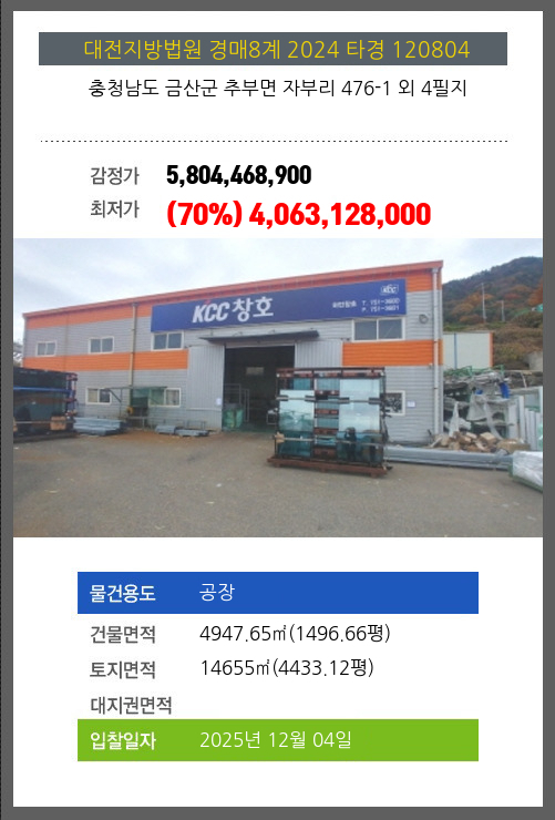 사건번호 2024 타경 120804 본건은 충청남도 금산군 추부면 자부리 476-1 외 4필지소재하는 공장경매 물건의 포스팅입니다. 건물면적 [ 4947.65㎡ (1496.66평) ]토지면적 [ 14655㎡ (4433.12평) ] 시세를