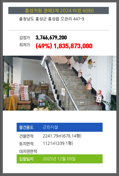 사건번호 2024 타경 4080 본건은 충청남도 홍성군 홍성읍 오관리 447-9소재하는 근린시설경매 물건의 포스팅입니다. 건물면적 [ 2241.79㎡ (678.14평) ]토지면적 [ 1121㎡ (339.1평) ] 시세를 반영한 감정가