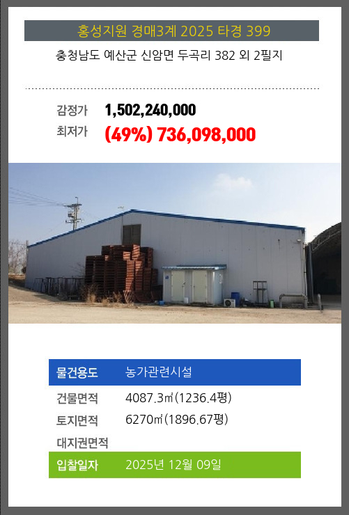 사건번호 2025 타경 399 본건은 충청남도 예산군 신암면 두곡리 382 외 2필지소재하는 농가관련시설경매 물건의 포스팅입니다. 건물면적 [ 4087.3㎡ (1236.4평) ]토지면적 [ 6270㎡ (1896.67평) ] 시세를