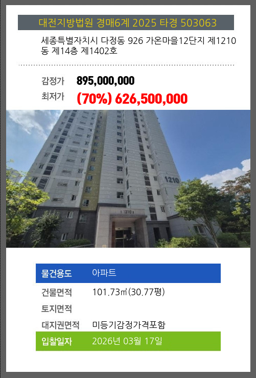 사건번호 2025 타경 503063 본건은 세종특별자치시 다정동 926 가온마을12단지 제1210동 제14층 제1402호소재하는 아파트경매 물건의 포스팅입니다. 건물면적 [ 101.73㎡ (30.77평) ]대지권 [ 미등기감정가격포함 ] 시세를 반영한