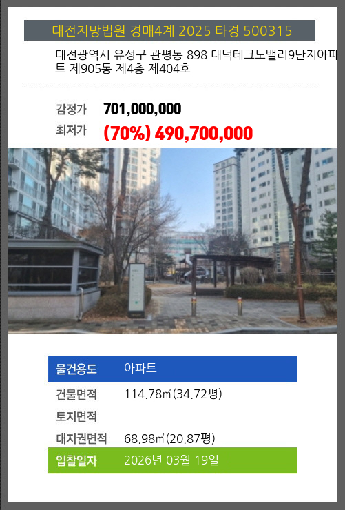사건번호 2025 타경 500315 본건은 대전광역시 유성구 관평동 898 대덕테크노밸리9단지아파트 제905동 제4층 제404호소재하는 아파트경매 물건의 포스팅입니다. 건물면적 [ 114.78㎡ (34.72평) ]대지권 [ 68.98㎡ (20.87평) ]