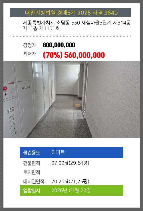 사건번호 2025 타경 3640 본건은 세종특별자치시 소담동 550 새샘마을3단지 제314동 제11층 제1101호소재하는 아파트경매 물건의 포스팅입니다. 건물면적 [ 97.99㎡ (29.64평) ]대지권 [ 70.26㎡ (21.25평) ] 시세를