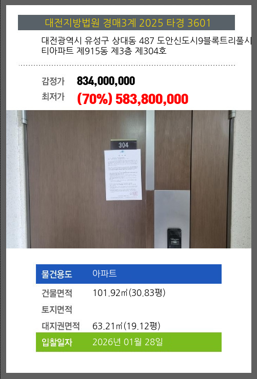 사건번호 2025 타경 3601 본건은 대전광역시 유성구 상대동 487 도안신도시9블록트리풀시티아파트 제915동 제3층 제304호소재하는 아파트경매 물건의 포스팅입니다. 건물면적 [ 101.92㎡ (30.83평) ]대지권 [ 63.21㎡ (19.12평) ]
