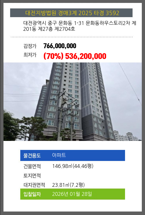 사건번호 2025 타경 3592 본건은 대전광역시 중구 문화동 1-31 문화동하우스토리2차 제201동 제27층 제2704호소재하는 아파트경매 물건의 포스팅입니다. 건물면적 [ 146.98㎡ (44.46평) ]대지권 [ 23.81㎡ (7.2평) ]