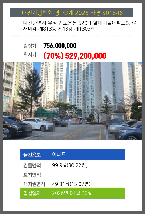 사건번호 2025 타경 501846 본건은 대전광역시 유성구 노은동 520-1 열매마을아파트8단지새미래 제813동 제13층 제1303호소재하는 아파트경매 물건의 포스팅입니다. 건물면적 [ 99.9㎡ (30.22평) ]대지권 [ 49.81㎡ (15.07평) ]