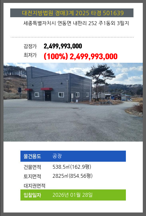 사건번호 2025 타경 501639 본건은 세종특별자치시 연동면 내판리 252 주1동외 3필지소재하는 공장경매 물건의 포스팅입니다. 건물면적 [ 538.5㎡ (162.9평) ]토지면적 [ 2825㎡ (854.56평) ] 시세를 반영한
