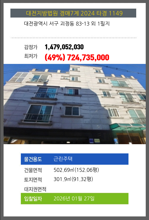 사건번호 2024 타경 1149 본건은 대전광역시 서구 괴정동 83-13 외 1필지소재하는 근린주택경매 물건의 포스팅입니다. 건물면적 [ 502.69㎡ (152.06평) ]토지면적 [ 301.9㎡ (91.32평) ] 시세를 반영한