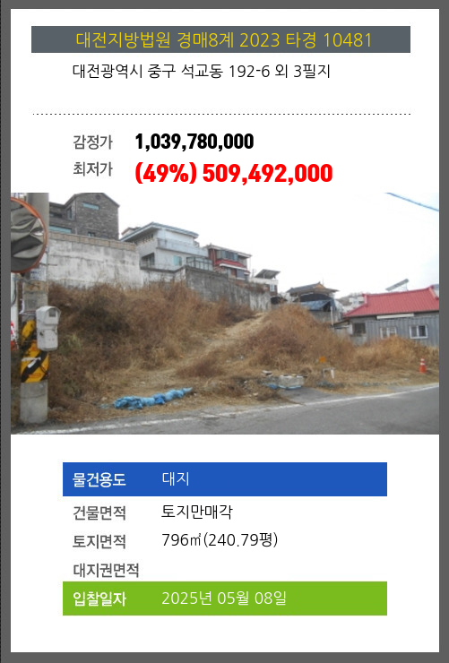 사건번호 2023 타경 10481 본건은 대전광역시 중구 석교동 192-6 외 3필지소재하는 대지경매 물건의 포스팅입니다. 건물면적 [ 토지만매각 ]토지면적 [ 796㎡ (240.79평) ] 시세를 반영한 감정가