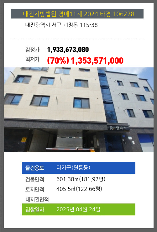 사건번호 2024 타경 106228 본건은 대전광역시 서구 괴정동 115-38소재하는 다가구(원룸등)경매 물건의 포스팅입니다. 건물면적 [ 601.38㎡ (181.92평) ]토지면적 [ 405.5㎡ (122.66평) ] 시세를 반영한 감정가 1,933,673,080에서1회