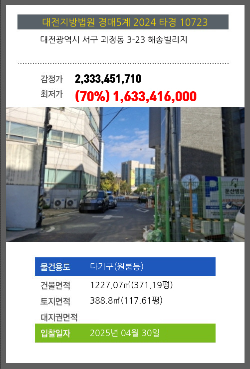 사건번호 2024 타경 10723 본건은 대전광역시 서구 괴정동 3-23 해송빌리지소재하는 다가구(원룸등)경매 물건의 포스팅입니다. 건물면적 [ 1227.07㎡ (371.19평) ]토지면적 [ 388.8㎡ (117.61평) ] 시세를 반영한 감정가
