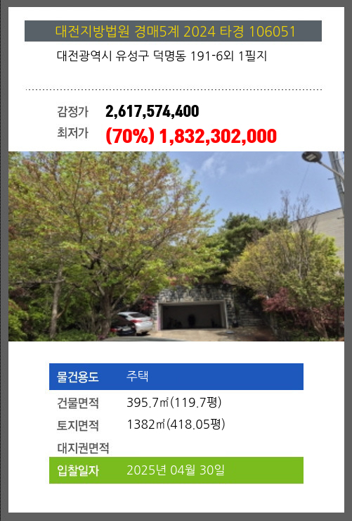 사건번호 2024 타경 106051 본건은 대전광역시 유성구 덕명동 191-6외 1필지소재하는 주택경매 물건의 포스팅입니다. 건물면적 [ 395.7㎡ (119.7평) ]토지면적 [ 1382㎡ (418.05평) ] 시세를 반영한 감정가
