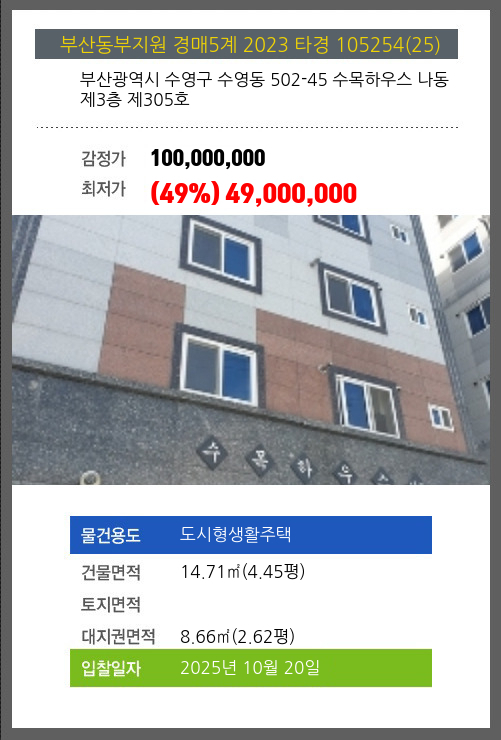 사건번호 2023 타경 105254(25) 본건은 부산광역시 수영구 수영동 502-45 수목하우스 나동 제3층 제305호소재하는 도시형생활주택경매 물건의 포스팅입니다. 건물면적 [ 14.71㎡ (4.45평) ]대지권 [ 8.66㎡ (2.62평) ]