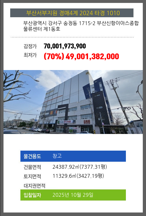 사건번호 2024 타경 1010 본건은 부산광역시 강서구 송정동 1715-2 부산신항이아스종합물류센터 제1동호소재하는 창고경매 물건의 포스팅입니다. 건물면적 [ 24387.92㎡ (7377.31평) ]토지면적 [ 11329.6㎡ (3427.19평) ] 시세를 반영한