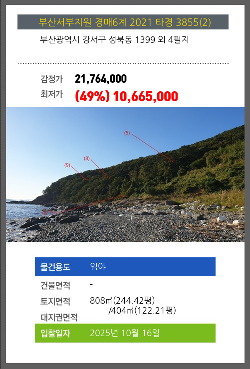 사건번호 2021 타경 3855(2) 본건은 부산광역시 강서구 성북동 1399 외 4필지소재하는 임야경매 물건의 포스팅입니다. 토지면적 [ 전체:808㎡ (244.42평) 매각지분:404㎡ (122.21평) ] 시세를 반영한 감정가 21,764,000에서2회