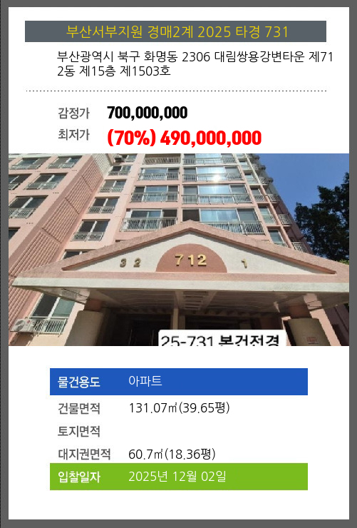 사건번호 2025 타경 731 본건은 부산광역시 북구 화명동 2306 대림쌍용강변타운 제712동 제15층 제1503호소재하는 아파트경매 물건의 포스팅입니다. 건물면적 [ 131.07㎡ (39.65평) ]대지권 [ 60.7㎡ (18.36평) ]
