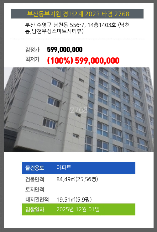 사건번호 2023 타경 2768 본건은 부산 수영구 남천동 556-7, 14층1403호 (남천동,남천우성스마트시티뷰)소재하는 아파트경매 물건의 포스팅입니다. 건물면적 [ 84.49㎡ (25.56평) ]대지권 [ 19.51㎡ (5.9평) ] 시세를 반영한