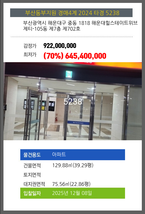 사건번호 2024 타경 5238 본건은 부산광역시 해운대구 중동 1818 해운대힐스테이트위브 제티-105동 제7층 제702호소재하는 아파트경매 물건의 포스팅입니다. 건물면적 [ 129.88㎡ (39.29평) ]대지권 [ 75.56㎡ (22.86평) ]