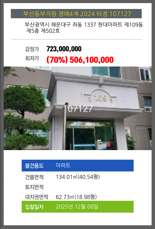 사건번호 2024 타경 107127 본건은 부산광역시 해운대구 좌동 1337 현대아파트 제109동 제5층 제502호소재하는 아파트경매 물건의 포스팅입니다. 건물면적 [ 134.01㎡ (40.54평) ]대지권 [ 62.73㎡ (18.98평) ]
