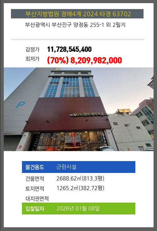 사건번호 2024 타경 63702 본건은 부산광역시 부산진구 양정동 255-1 외 2필지소재하는 근린시설경매 물건의 포스팅입니다. 건물면적 [ 2688.62㎡ (813.3평) ]토지면적 [ 1265.2㎡ (382.72평) ] 시세를 반영한