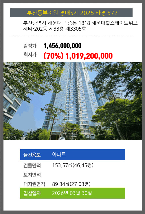 사건번호 2025 타경 572 본건은 부산광역시 해운대구 중동 1818 해운대힐스테이트위브 제티-202동 제33층 제3305호소재하는 아파트경매 물건의 포스팅입니다. 건물면적 [ 153.57㎡ (46.45평) ]대지권 [ 89.34㎡ (27.03평) ]