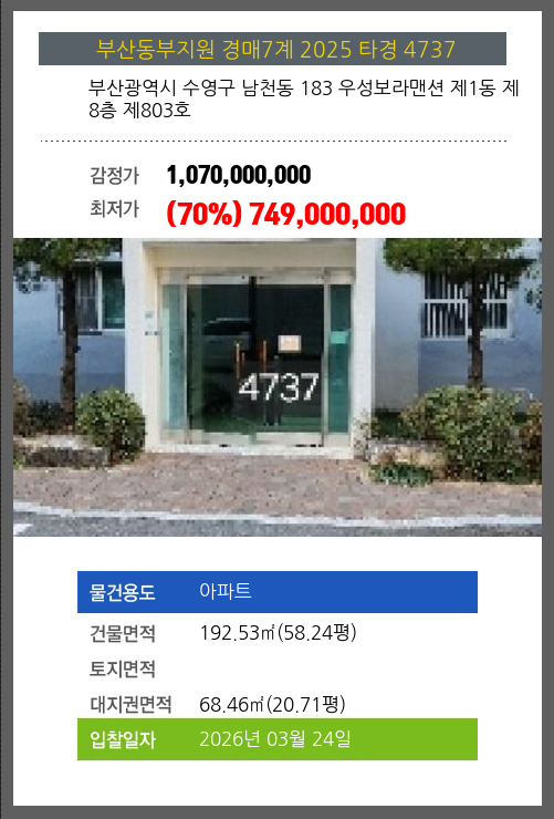 사건번호 2025 타경 4737 본건은 부산광역시 수영구 남천동 183 우성보라맨션 제1동 제8층 제803호소재하는 아파트경매 물건의 포스팅입니다. 건물면적 [ 192.53㎡ (58.24평) ]대지권 [ 68.46㎡ (20.71평) ]