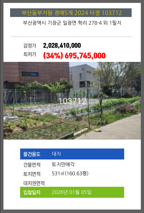 사건번호 2024 타경 103712 본건은 부산광역시 기장군 일광면 학리 278-4 외 1필지소재하는 대지경매 물건의 포스팅입니다. 건물면적 [ 토지만매각 ]토지면적 [ 531㎡ (160.63평) ] 시세를 반영한