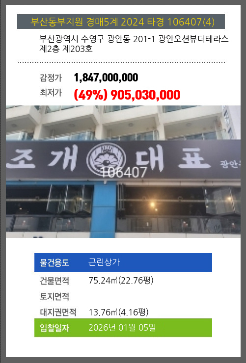 사건번호 2024 타경 106407(2) 본건은 부산광역시 수영구 광안동 201-1 광안오션뷰더테라스 제2층 제201호소재하는 근린상가경매 물건의 포스팅입니다. 건물면적 [ 88.11㎡ (26.65평) ]대지권 [ 13.76㎡ (4.16평) ] 시세를