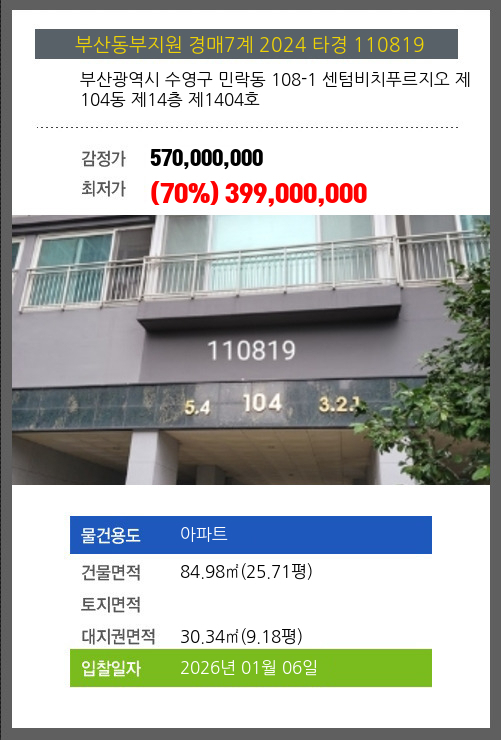 사건번호 2024 타경 110819 본건은 부산광역시 수영구 민락동 108-1 센텀비치푸르지오 제104동 제14층 제1404호소재하는 아파트경매 물건의 포스팅입니다. 건물면적 [ 84.98㎡ (25.71평) ]대지권 [ 30.34㎡ (9.18평) ]