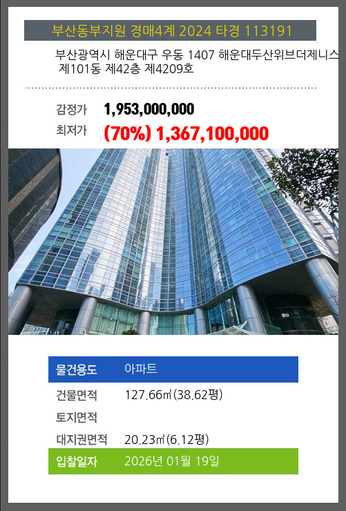 사건번호 2024 타경 113191 본건은 부산광역시 해운대구 우동 1407 해운대두산위브더제니스 제101동 제42층 제4209호소재하는 아파트경매 물건의 포스팅입니다. 건물면적 [ 127.66㎡ (38.62평) ]대지권 [ 20.23㎡ (6.12평) ]