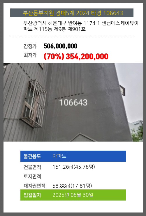사건번호 2024 타경 106643 본건은 부산광역시 해운대구 반여동 1174-1 센텀에스케이뷰아파트 제115동 제9층 제901호소재하는 아파트경매 물건의 포스팅입니다. 건물면적 [ 151.26㎡ (45.76평) ]대지권 [ 58.88㎡ (17.81평) ]